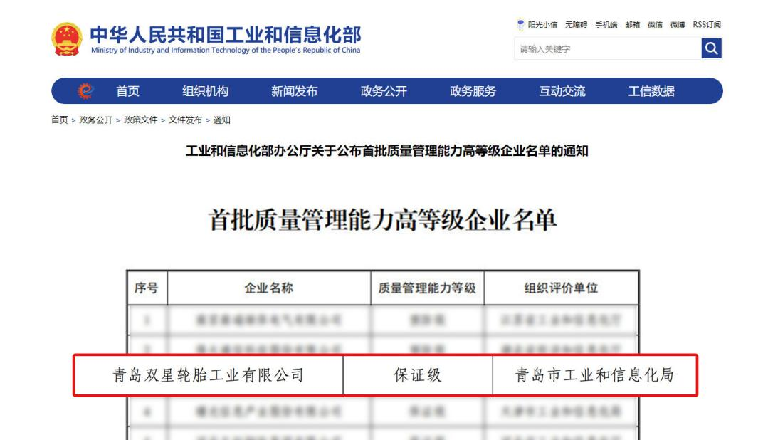 行業(yè)唯一!雙星輪胎入選工信部質量管理能力高等級企業(yè)名單